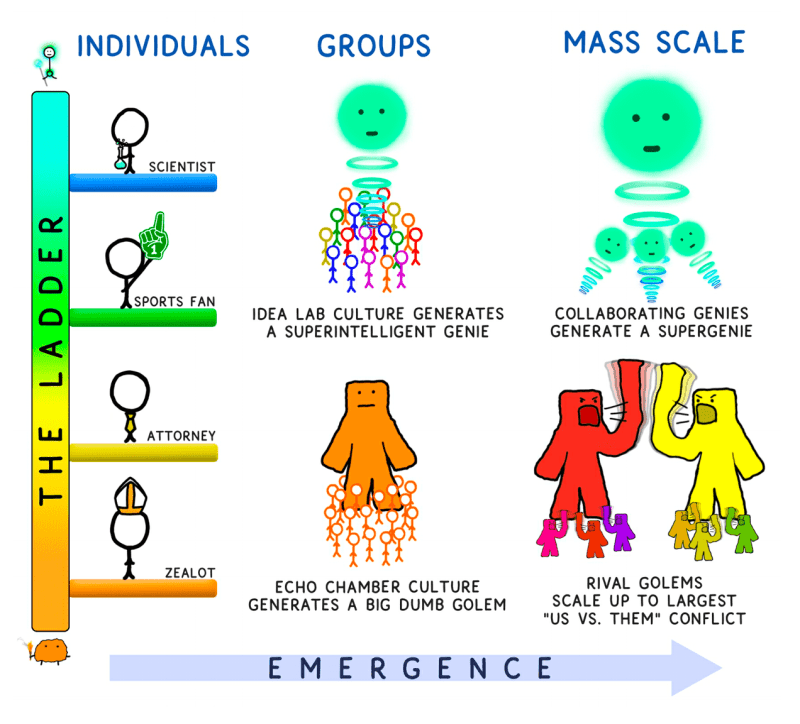 טים אורבן כותב בפתיחה של הספר שלו שכל אדם נמצא על ה-Idea Spectrum ביחס לכל מיני רעיונות. לדוגמא: מה עמדתי לגבי מדינת ישראל? מה עמדתי לגבי הרפורמה / מהפיכה המשפטית? מה דעתי לגבי דרעי כשר בממשלתנו? מה דעתי לגבי מחיר הקוטג׳? מה דעתי לגבי לזרוק או לשמור קוטג׳ שנשאר בסוף הארוחה? הדעה שלנו, לטענת אורבן, נעה על ציר נוסף שהוא המוח הפרימיטיבי לעומת המוח החושב. המוח הפרימיטיבי הוא זה שמניע אותנו להיות חלק; חלק מהמשפחה שלנו, חלק מהקהילה, חלק מהזהות שטיפחנו בעצמנו. המוח החושב הוא ה״מדען״, זה שחוקר ורוצה לעשות את הדבר הנכון והטוב, זה שמפקפק בדעות קיימות.